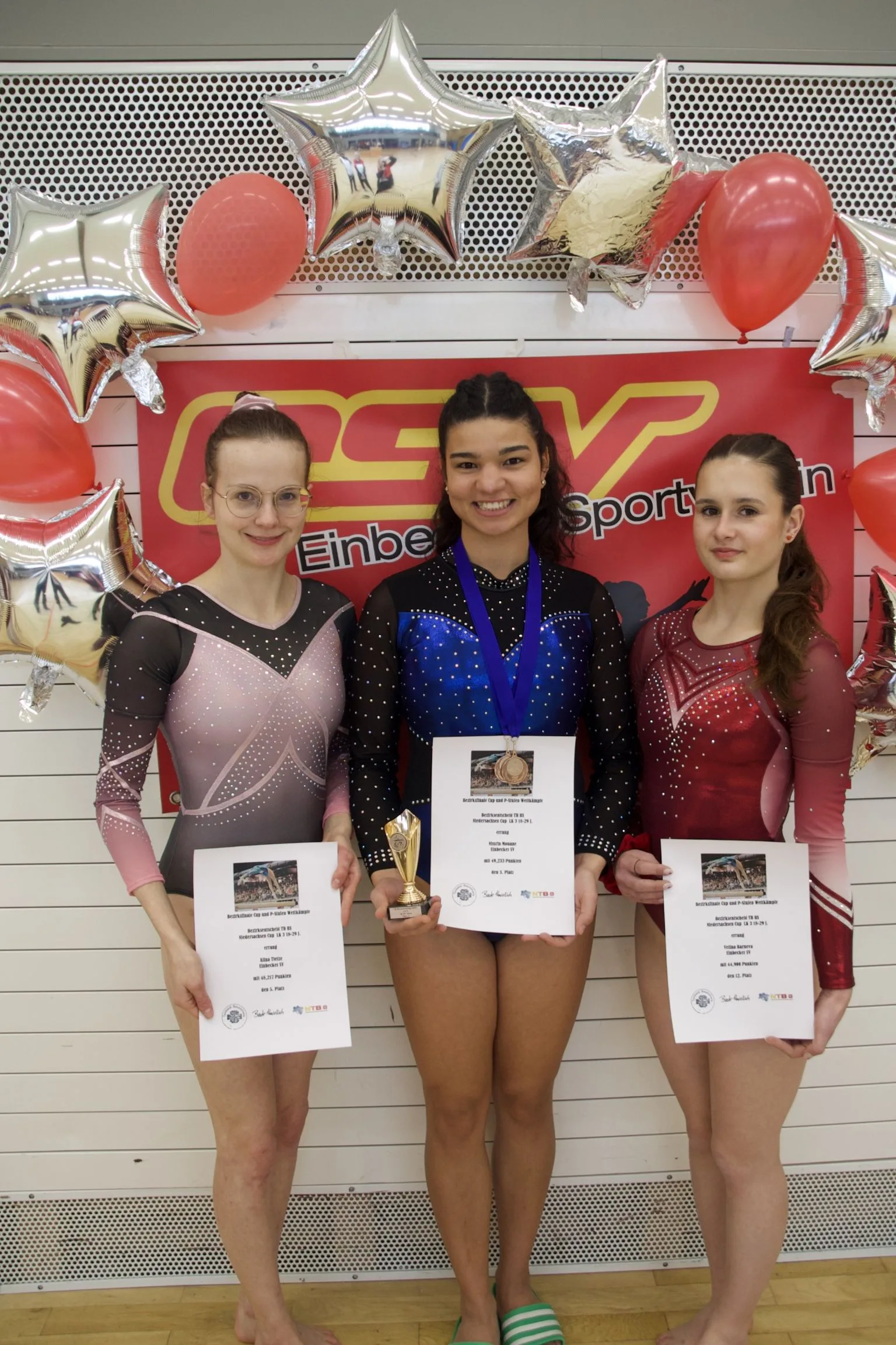 Kürzlich standen die Bezirksmeisterschaften im Gerätturnen weiblich an, die der Einbecker Sportverein in der Hubeweghalle ausrichtete. Um daran teilnehmen zu können, mussten die Sportlerinnen auf Kreisebene vordere Plätze belegen. Das gelang 17 Einbeckerinnen, die sich freuten, in der heimischen Turnhalle ihr Können vor vielen Zuschauern präsentieren zu können. Im Wettbewerb der Pflichtstufen P6 und P7 starteten vom ESV Kira Zhuarevska und Hanna Cohrs. Für beide war es der erste Wettkampf in dieser Wettkampfstufe auf Bezirksebene. Aufgrund eines Sturzes verpasste Kira das Treppchen knapp und belegte den sechsten Platz. Am Sprung konnte sie sich den zweiten Rang sichern und wurde Vizebezirksmeisterin. Für Hanna lief der Wettkampf nicht wie geplant. Wegen großer Nervosität vergaß sie ihre Übung und musste einige Punkte liegen lassen, wodurch es nur zu Platz 23 reichte. Im Wettkampf der Pflichtstufen P6 bis P8 startete Philine Grascha. Als eine der jüngsten Sportlerinnen konnte sie sich gut beweisen. Besonders am Sprung und Balken zählte sie zu den besten. Sie belegte Platz 14 von 30 Sportlerinnen. Bei den jüngsten Pflichtturnerinnen der P5 traten Tilda Reims, Romy Gebauer und Yeva Romaniuk an, für die es die allerersten Bezirksmeisterschaften waren. Einige Punkte ließen auch sie wegen Nervosität liegen, konnten sich aber im Vergleich zu den Kreismeisterschaften deutlich verbessern. Am Ende belegte Romy, die am Sprung knapp das Podest verpasste, Platz 13 sowie Yeva Platz 22 und Tilda Platz 23. In der Kür-Leistungsklasse 2 der jüngeren Jahrgänge startete Josephine Takenga gut in den Wettkampf. Sie musste jedoch am Balken zweimal das Gerät verlassen, weshalb es am Ende mit dem achten Platz ganz knapp nicht für die Qualifikation zu den Landesmeisterschaften reichte. Ihr nahezu fehlerfreien Sprungs brachte ihr den Titel der Vizebezirksmeisterin ein. In der selben Leistungsklasse, aber der älteren Turnerinnen (18 bis 29 Jahre), starteten drei ESV-Sportlerinnen. Janet Ulczok kam nahezu fehlerfrei durch den Wettkampf und sicherte sich den dritten Rang. Zudem konnte sie sich über drei weitere Medaillen am Sprung, Balken und Boden freuen. Für Lea Beulshausen und Lena-Marie Reger lief der Wettkampf etwas holprig. Lea ließ wichtige Punkte am Boden liegen, wodurch sie mit dem achten Rang knapp die Qualifikation für das Land verpasste. Zudem fehlten ihr nur 0,05 Punkte zur Bronzemedaille am Balken. Bei Lena-Marie war es das »Zittergerät«, der Schwebebalken, den sie mehrmals verlassen musste. Am Ende sprang für sie der zehnte Rang heraus. In der Leistungsklasse 3 der jüngeren Jahrgänge waren vom ESV Spyridoula Analyti, Kira Denissenko und Marie Kretzschmar vertreten. Für Spyridoula war es der erste Kür-Wettkampf auf Bezirksebene. Sie kam gut durch den Wettkampf und belegte in einem starken Teilnehmerfeld den guten achten Rang. Damit verfehlte sie nur knapp die Landesqualifikation. Besonders glänzte sie am Balken, an dem sich den Titel der Bezirksmeisterin sicherte. Für Marie und Kira startete der Wettkampf am Sprung und Barren gut. Leider mussten beide am Balken Stürze hinnehmen, wodurch es Platz 11 und 12 für sie wurde. Damit befanden sie sich trotzdem noch im vorderen Bereich des starken Teilnehmerfeldes. Marie verpasste zudem knapp die Bronzemedaille am Barren. In der Leistungsklasse 3 der älteren Turnerinnen (18 bis 29 Jahre) starteten vom ESV Alina Tietze, Nissrin Mouane und Velina Barneva. Bei Nissrin und Alina lief der Wettkampf gut. Nissrin sicherte sich den dritten Platz im Mehrkampf sowie weitere Medaillen am Balken und Boden. Auf den starken fünften Platz kam Alina, die sich damit auch für die Landesmeisterschaften qualifizierte. Velina verpasste dies leider knapp. Glücklich war der Einbecker SV über das erfolgreiche Wochenende. Landesqualifikationen sowie viele Podestplätze im Mehrkampf und an den Geräten spiegeln wider, dass sich die Einbeckerinnen im stärksten Turnbezirk Niedersachsens wieder gut behaupteten. oh BU 822 Alina Tietze, Nissrin Mouane und Velina Barneva (von links) zeigten in der Leistungsklasse 3 ihr Können. BU 928 In der Leistungsklasse 2 traten erfolgreich bei den Bezirksmeisterschaften an (von links) Lea Beulshausen, Janet Ulczok und Lena-Marie Reger.
