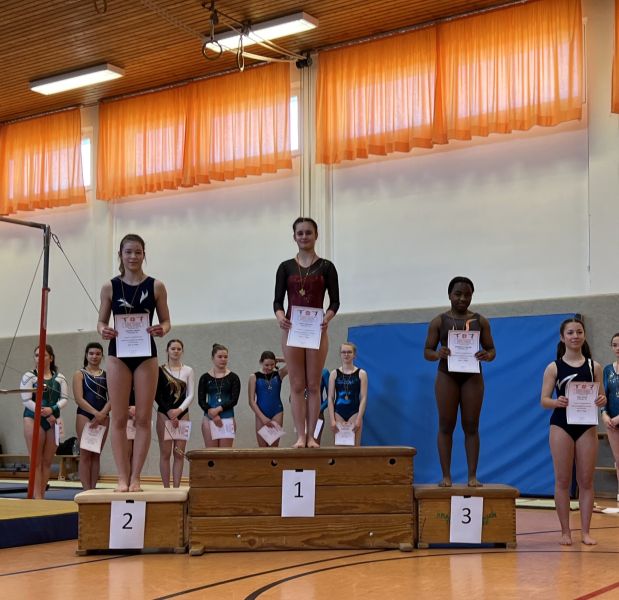 Den Anforderungen der LK3 stellten sich vier ESV-Turnerinnen der Jahrgänge 2005 bis 2008. Ihren allerersten Wettkampf absolvierte Nika Schulz, ihre Nervosität war groß. Dazu kam, dass sie auch noch am Balken beginnen musste. Nach einer soliden Übung mit einem Sturz war dann die Aufregung verflogen, sie zeigte an den anderen Geräten gute Übungen und freute sich über den vierten Platz. Im selben Wettkampf standen die drei weitere ESV-Turnerinnen auf dem Treppchen. Den Titel holte sich Velina Barneva mit 1,6 Punkten Vorsprung vor Josefine Jäckel und Josephine Takenga (Foto). Vor allem um den zweiten und dritten Platz gab es ein Kopf-an-Kopf-Rennen. Die Wertungen lagen oft eng beieinander. Die Entscheidung fiel am Balken, an dem Velina, Josefine und Josepine jeweils größere Abstände trennten.