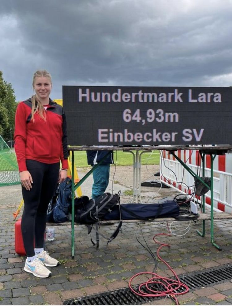 Am Samstagnachmittag ließ Lara Hundertmark vom Einbecker SV in der weiblichen U23 mit einem starken Wettkampf aufhorchen: Mit 64,93 m übertraf sie nicht nur ihre bisherige PB deutlich, sondern auch die U23-EM-Norm von 64,50 m – am Ende Platz 2 und eine stabile Serie um die 63 m.