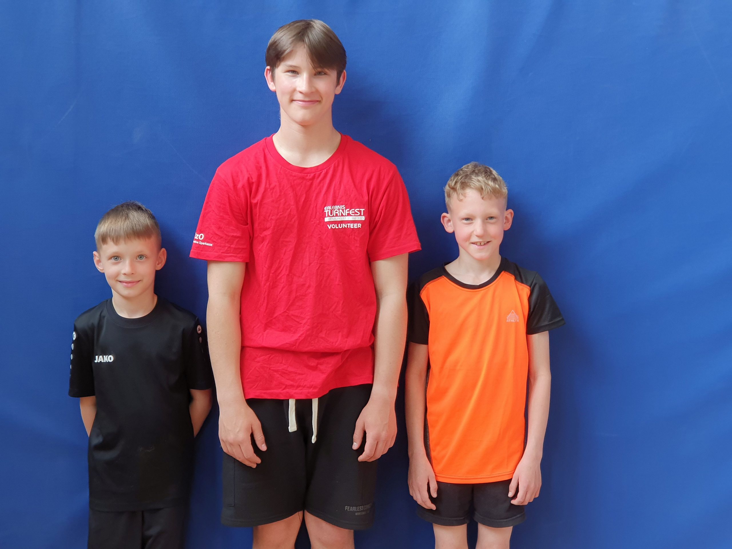 Gleich drei ESV-Turner gingen in der Altersklasse 14-15 Jahre an den Start. Andreii Magurov wählte dreimal Turnen und Trampolin aus. Hier erlernte er noch kurz vor dem Wettkampf einen gestreckten Salto mit ½ Drehung und belegte dann den 9. Platz vor seinem Vereinskamerad Nikita Dykun, der mit seinem Wahlwettkampf aus Turnen, Schwimmen, Leichtathletik und Trampolinspringenden 10. Platz belegte. David Prokopovych (2x Turnen, Trampolin und 100m-Lauf) war der dritte im Bunde und belegte Platz 14.